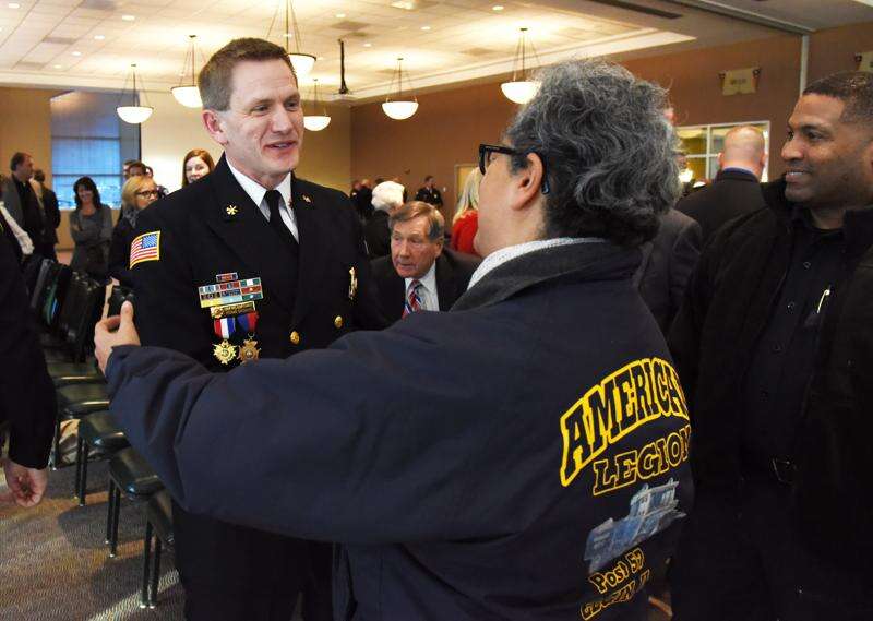 Robb Cagann, Elgin's newest assistant fire chief, greeted people Friday after a ceremony at the Centre of Elgin. John Starks/jstarks@dailyherald.com
