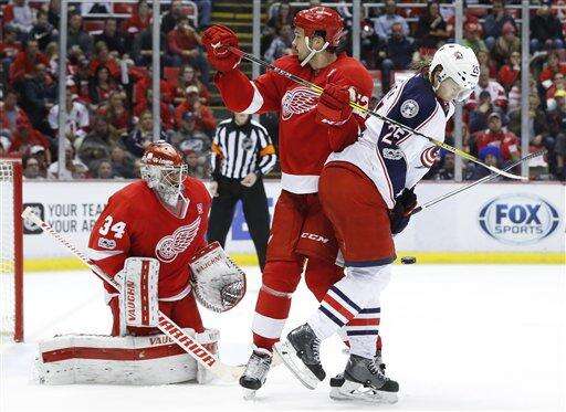 Columbus Blue Jackets center William Karlsson (25) is hit by a shot on Detroit Red Wings goalie Petr Mrazek (34) as defenseman Jonathan Ericsson (52) defends in the third period of an NHL hockey game Tuesday, Feb. 7, 2017, in Detroit. (AP Photo/Paul Sancya)