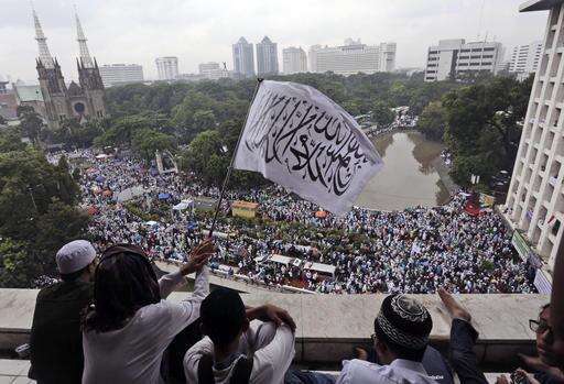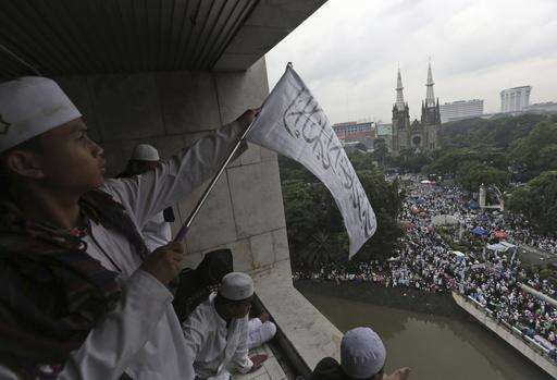 A Muslim man waves a flag with Arabic writings which reads "There's no God but Allah and Muhammad is His messenger" during a rally at Istiqlal Mosque in Jakarta, Indonesia Saturday, Feb. 11, 2017. Tens of thousands gathered at the national mosque for the mass prayers on Saturday urging Indonesians to vote for Muslims in city and district elections being held across the country next week. (AP Photo/Achmad Ibrahim) The Associated Press