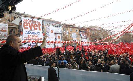 Turkish President Recep Tayyip Erdogan addresses his supporters in Aksaray, Turkey, Friday, Feb. 10, 2017. Erdogan on Friday approved holding a national referendum on constitutional reforms that would usher in a powerful presidency. Erdogan signed off on the bill, paving the way for the country's electoral board to set a date for the referendum.(Kayhan Ozer/Presidential Press Service, Pool Photo via AP) The Associated Press