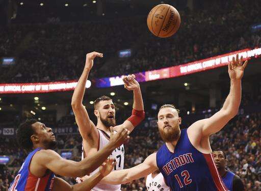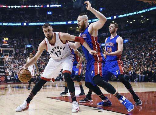 Toronto Raptors centre Jonas Valanciunas (17) protects the ball as he is defended by Detroit Pistons centre Aron Baynes (12) and Pistons forward Jon Leuer (30) during first half NBA basketball action in Toronto on Sunday, Feb.12, 2017. (Frank Gunn/The Canadian Press via AP) The Associated Press