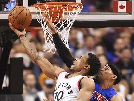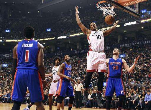 Toronto Raptors guard DeMar DeRozan (10) scores as Detroit Pistons' Reggie Jackson (1), Marcus Morris (13) and Jon Leuer (30) look on during first-half NBA basketball game action in Toronto, Sunday, Feb.12, 2017. (Frank Gunn/The Canadian Press via AP) The Associated Press