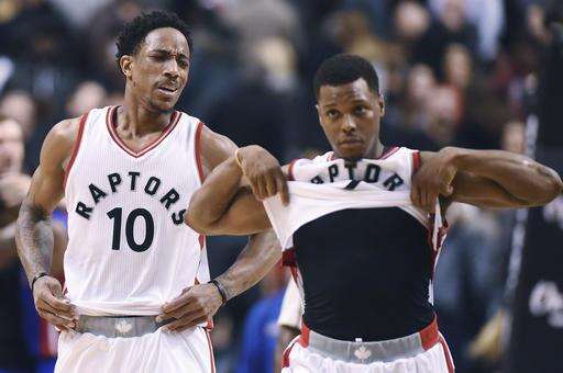 Toronto Raptors guard DeMar DeRozan (10) and Toronto Raptors guard Kyle Lowry (7) react after losing to the Detroit Pistons in NBA basketball action in Toronto on Sunday, Feb. 12, 2017. (Frank Gunn/The Canadian Press via AP) The Associated Press