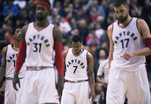 Toronto Raptors guard Kyle Lowry (7) and teammates walk off the court after losing to the Detroit Pistons in NBA basketball action in Toronto on Sunday, Feb. 12, 2017. (Frank Gunn/The Canadian Press via AP) The Associated Press