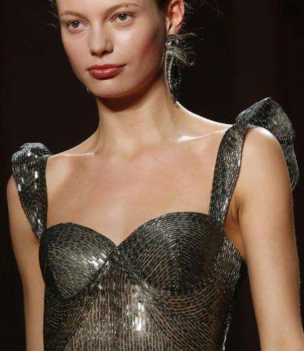 There were plenty of equally shimmering gowns at Tuesday's runway show, including a few striking Deco-inspired looks - in gold metallic thread, or sequins. Khan also showed flouncy party dresses in tea length; a silvery sequined dress with ruffle straps and a peplum detail looked like almost like a very chic suit of armor. Embellishment was still key; Khan said he had experimented with new types of embroidery and placing sequins at different angles, to create texture and catch the light.
