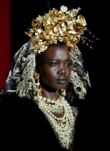 As the final design made its way down the runway on Tuesday - a grand, glistening, golden bridal gown, with a gold floral crown and a cascading veil with a black-and-gold train - the soundtrack played Maya Angelou reading her poem, "Human Family."