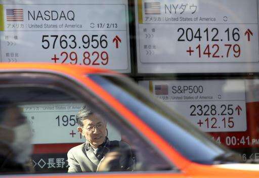 A man waits to cross a street in front of an electronic stock indicator of a securities firm in Tokyo, Tuesday, Feb. 14, 2017. Shares in Asia fell back after an early rally on Tuesday, as investors awaited comments to Congress by Federal Reserve chair Janet Yellen. (AP Photo/Shizuo Kambayashi) The Associated Press