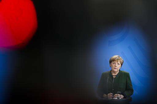 In this photo taken with a red television camera control light in front, German Chancellor Angela Merkel attends a news conference with Tunisian Prime Minister Youssef Chahed after talks at the chancellery in Berlin, Tuesday, Feb. 14, 2017. (AP Photo/Markus Schreiber)