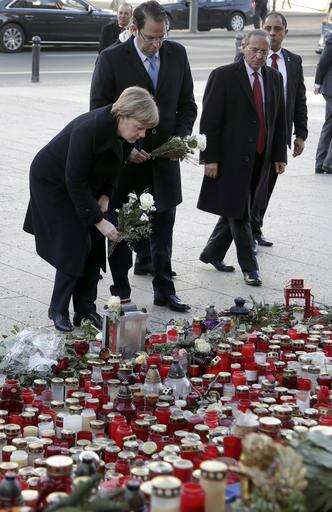 The two leaders placed individual white roses Tuesday at a makeshift memorial to the Dec. 19 attack victims in Berlin.