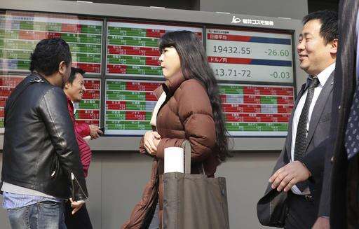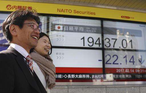People walk past an electronic stock indicator of a securities firm in Tokyo, Tuesday, Feb. 14, 2017. Shares in Asia fell back after an early rally on Tuesday, as investors awaited comments to Congress by Federal Reserve chair Janet Yellen. (AP Photo/Shizuo Kambayashi)