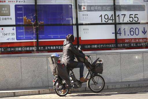 A man waits to cross a street in front of an electronic stock indicator of a securities firm in Tokyo, Tuesday, Feb. 14, 2017. Shares in Asia fell back after an early rally on Tuesday, as investors awaited comments to Congress by Federal Reserve chair Janet Yellen. (AP Photo/Shizuo Kambayashi)
