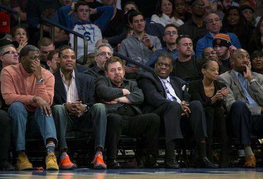 Madison Square Garden chairman James Dolan, center left, sits with former New York Knicks team members and others as he watched the Knicks take on the San Antonio Spurs during an NBA basketball game at Madison Square Garden in New York, Sunday, Feb. 12, 2017. (AP Photo/Craig Ruttle) The Associated Press