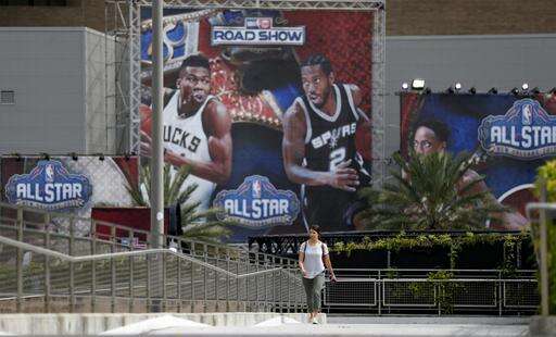 Rachel Seibel walks past signage being put up in preparation for the NBA All Star Game festivities this weekend, in New Orleans, Tuesday, Feb. 14, 2017. Charlotte won't be a ghost town this weekend, but it sure won't be buzzing like many had hoped when the NBA awarded the city the 2017 All-Star game. The league moved the event last summer after North Carolina politicians failed to repeal House Bill 2, a law that passed last March that limits the protections of LGBT people.(AP Photo/Gerald Herbert) The Associated Press
