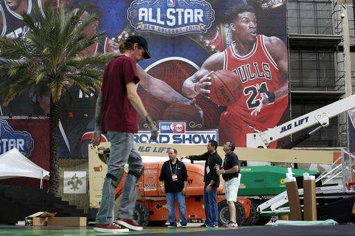 David Husney, right, Billy Proctor, center, and Scott Cockerill work during the setup of fan participation events in preparation for the NBA All-Star Game festivities this weekend, in New Orleans, Tuesday, Feb. 14, 2017. Charlotte won't be a ghost town this weekend, but it sure won't be buzzing like many had hoped when the NBA awarded the city the 2017 All-Star game. The league moved the event last summer after North Carolina politicians failed to repeal House Bill 2, a law that passed last March that limits the protections of LGBT people. (AP Photo/Gerald Herbert) The Associated Press