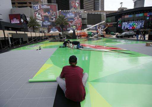 Scott Lokker, foreground, Chris Lokker, far left, and Randy Hinson, lay down flooring for fan participation events, in preparation for the NBA All-Star Game festivities this weekend, in New Orleans, Tuesday, Feb. 14, 2017. Charlotte won't be a ghost town this weekend, but it sure won't be buzzing like many had hoped when the NBA awarded the city the 2017 All-Star game. The league moved the event last summer after North Carolina politicians failed to repeal House Bill 2, a law that passed last March that limits the protections of LGBT people. (AP Photo/Gerald Herbert) The Associated Press
