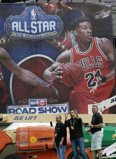 Scott Lokker, left, David Husney, right, Billy Proctor, second right and Scott Cockerill work during the setup of fan participation events in preparation for the NBA All-Star Game festivities this weekend, in New Orleans, Tuesday, Feb. 14, 2017. Charlotte won't be a ghost town this weekend, but it sure won't be buzzing like many had hoped when the NBA awarded the city the 2017 All-Star game. The league moved the event last summer after North Carolina politicians failed to repeal House Bill 2, a law that passed last March that limits the protections of LGBT people. (AP Photo/Gerald Herbert) The Associated Press