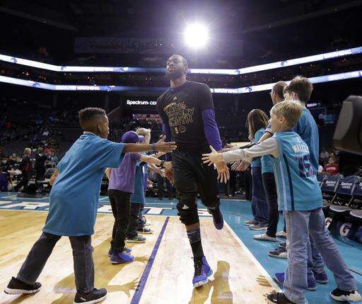 Charlotte Hornets' Kemba Walker greets fans as he takes the court before an NBA basketball game against the Philadelphia 76ers in Charlotte, N.C., Monday, Feb. 13, 2017. Charlotte won't be a ghost town this weekend, but it sure won't be buzzing like many had hoped when the NBA awarded the city the 2017 All-Star game. But the league moved the event last summer after North Carolina politicians decided against repealing House Bill 2, a law that passed last March that restricts the rights of LGBT people. (AP Photo/Chuck Burton) The Associated Press