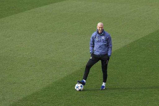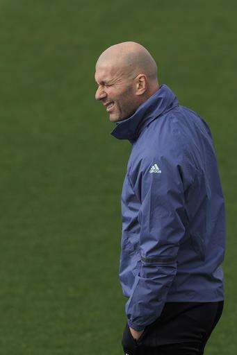 Real Madrid's head coach Zinedine Zidane looks at his players during a training session at the Valdebebas stadium ahead of Wednesday's Champions League soccer match between Real Madrid and Napoli, in Madrid, Spain, Tuesday, Feb. 14, 2017 . (AP Photo/Daniel Ochoa de Olza) The Associated Press