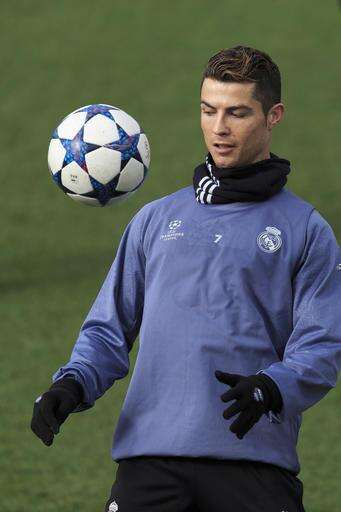 Real Madrid's Cristiano Ronaldo eyes a ball during a training session at the Valdebebas stadium ahead of Wednesday's Champions League soccer match between Real Madrid and Napoli, in Madrid, Spain, Tuesday, Feb. 14, 2017 . (AP Photo/Daniel Ochoa de Olza) The Associated Press
