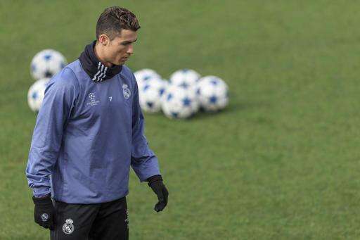 Real Madrid's Cristiano Ronaldo eyes the ball during a training session at the Valdebebas stadium ahead of Wednesday's Champions League soccer match between Real Madrid and Napoli, in Madrid, Spain, Tuesday, Feb. 14, 2017 . (AP Photo/Daniel Ochoa de Olza) The Associated Press