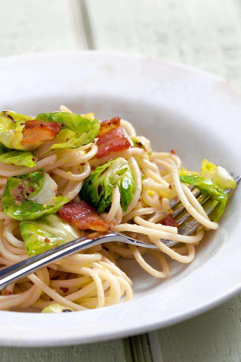 Brussels Sprouts Pasta With Whole-Grain Mustard. Here, the sprouts are separated into leaves, crisped in the pan with garlic and tossed with just enough mustard and butter to make them taste rich. Deb Lindsey/The Washington Post