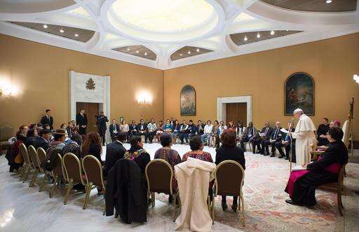 VATICAN CITY (AP) - Pope Francis insisted Wednesday that indigenous groups must give prior consent to any economic activity affecting their ancestral lands, a view that conflicts with the Trump administration, which is pushing to build a $3.8 billion oil pipeline over opposition from American Indians.