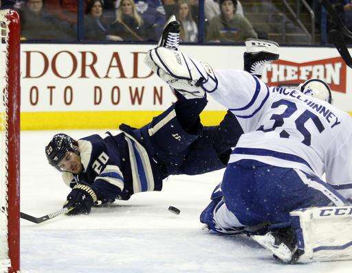 Columbus Blue Jackets forward Brandon Saad, left, is tripped in front of Toronto Maple Leafs goalie Curtis McElhinney during the second period of an NHL hockey game in Columbus, Ohio, Wednesday, Feb. 15, 2017. (AP Photo/Paul Vernon) The Associated Press