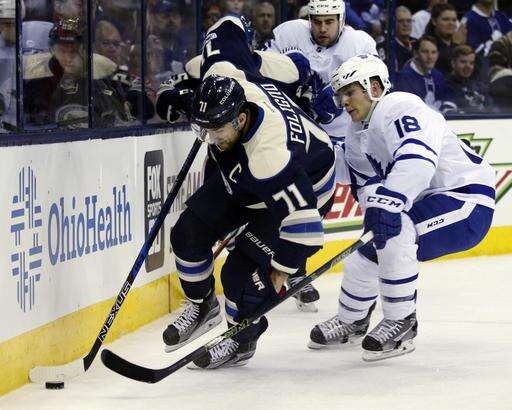Columbus Blue Jackets forward Nick Foligno, left, works against Toronto Maple Leafs forward Ben Smith during the second period of an NHL hockey game in Columbus, Ohio, Wednesday, Feb. 15, 2017. (AP Photo/Paul Vernon) The Associated Press
