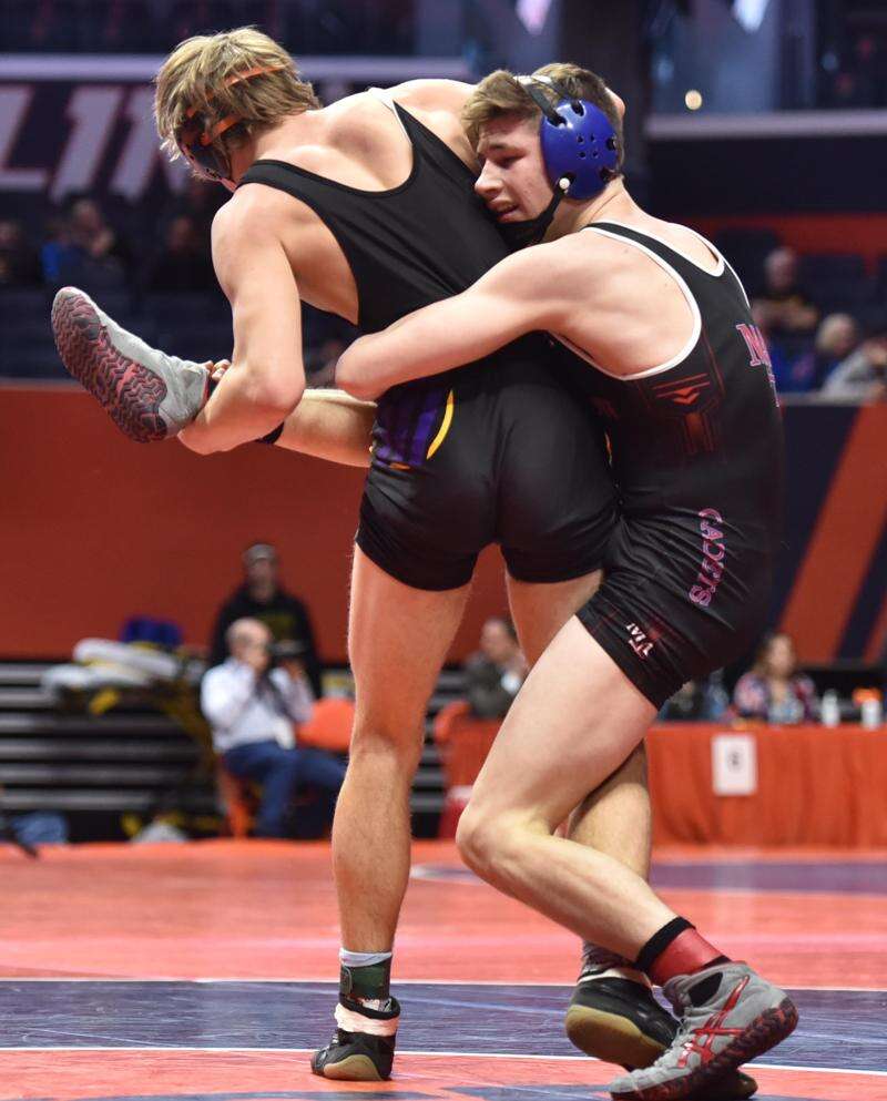 Wheaton North's Duncan Nelson is wrapped up by Lockport's Baylor Fernandes Friday in the Class 3A 145 -pound quarterfinal bout at the IHSA state wrestling tournament preliminaries.