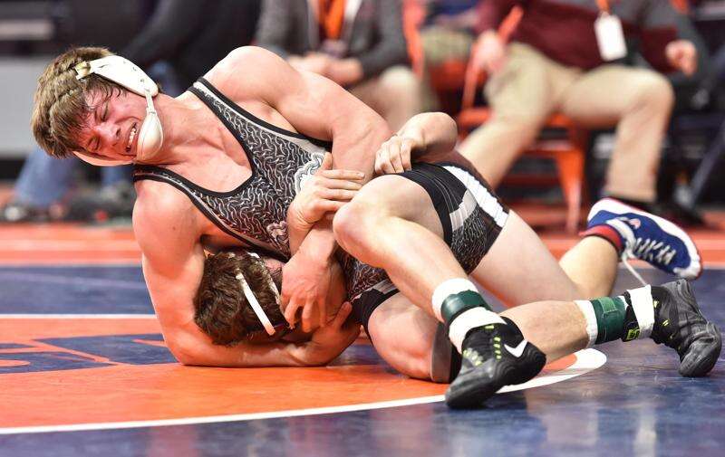 Aurora Christian's Zeke Marshall and IC Catholic's Joey Bianchini wrestle Friday in the Class 1A semifinal 113-pound bout at the IHSA state wrestling tournament in Champaign.