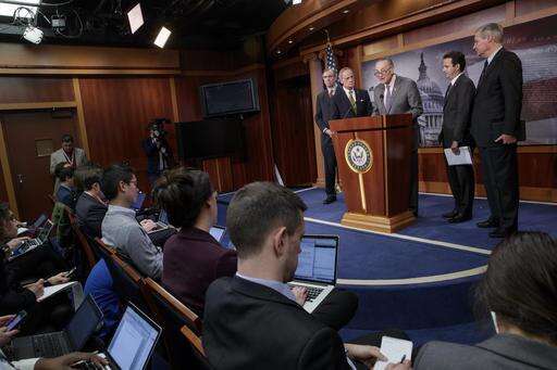 Senate Democrats, from left, Sen. Jeff Merkley, D-Ore., Sen. Tom Carper, D-Del., Minority Leader Chuck Schumer of N.Y., Sen. Brian Schatz, D-Hawaii, and Sen. Sheldon Whitehouse, D-R.I., participate in a news conference on Capitol Hill in Washington, Friday, Feb. 17, 2017, announce their request of the Republican majority to delay the confirmation vote on President Donald Trump's controversial nominee to lead the Environmental Protection Agency, Scott Pruitt, until the nominee turns over the thousands of requested emails from his time as attorney general of Oklahoma. (AP Photo/J. Scott Applewhite) The Associated Press