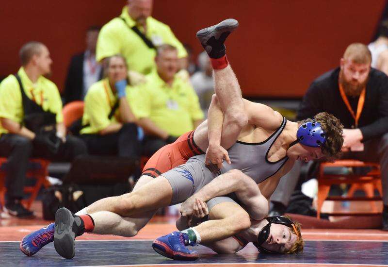 Marmion Academy's Peter Ferraro wins fifth place against Stevenson's Nikita Nepomnyashchiy Saturday in the Class 3A 170-pound bout at the IHSA state wrestling tournament in Champaign.