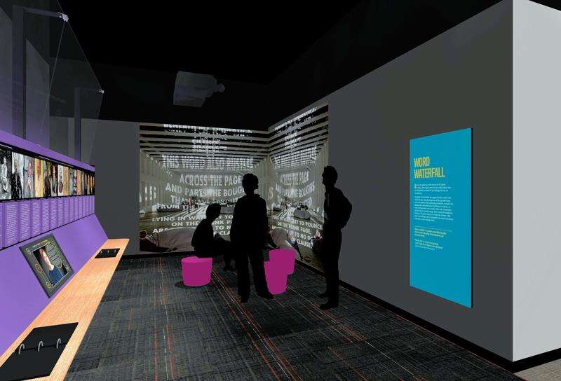 One creative space is the "Word Waterfall," where words float down a screen and assemble in unique ways. "The Surprise Bookshelf" includes edge-lit boxes with a writing example that slide open to reveal something interesting about the work. In "The Mind of a Writer" gallery, works are examined more closely, to understand each writer's mindset and methodology.