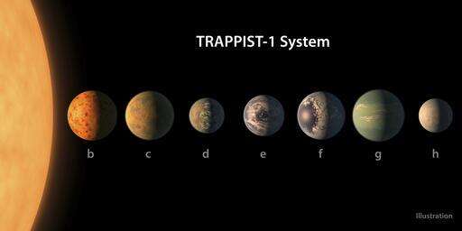 This star system is less than 40 light-years from Earth, or 235 trillion miles away, in the constellation Aquarius. At the hub is a small, faint star known as Trappist-1. Seven planets circle Trappist-1, with orbits ranging from 1 ˆ½ to 20 days. If Trappist-1 were our sun, all these planets would fit inside the orbit of Mercury. That's how close they are to their star and why their orbits are so short. The planets have no real names. They're only known by letters, "b'' through "h." The letter "A" refers to the star itself.