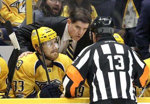 Nashville Predators coach Peter Laviolette talks with official Dan O'Halloran (13) as Laviolette challenges a call negated a Predators goal against the Calgary Flames during the first period of an NHL hockey game Tuesday, Feb. 21, 2017, in Nashville, Tenn. The call on the ice was reversed and the Predators were awarded the goal. (AP Photo/Mark Humphrey)