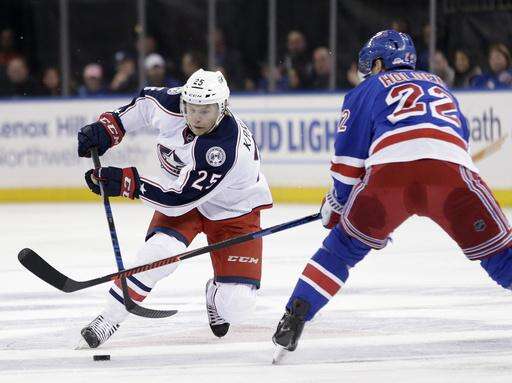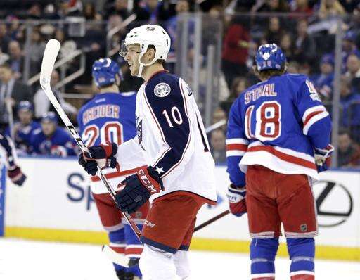 NOTES: The Blue Jackets, now 12-4-1 against Metropolitan Division teams this season, play 11 of their remaining 22 games in the division. ... Columbus improved to 28-7-3 when scoring first, and 25-1-2 when leading after two periods. ... The Rangers have allowed a power-play goal in four of their last five games. ... New York fell to 5-15-0 when trailing after two periods and 8-2-0 in the second game of back-to-backs. ... Lundqvist (402 wins) remained one victory behind Grant Fuhr for 10th place on the NHL's career list and one from tying Martin Brodeur for the most in a goalie's first 12 seasons. ... Rangers D Kevin Klein (back spasms) missed his third straight game.