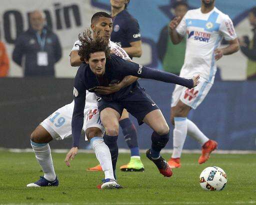Marseille's William Vainqueur, behind, challenges for the ball with Paris Saint Germain's Adrien Rabiot, during the League One soccer match between Marseille and Paris Saint-Germain, at the Velodrome Stadium, in Marseille, southern France, Sunday, Feb. 26, 2017. (AP Photo/Claude Paris) The Associated Press