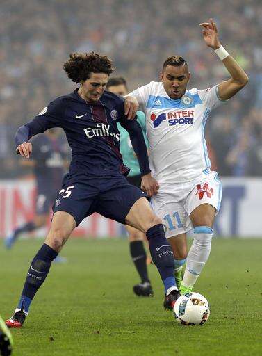 Marseille's Dimitri Payet, right, challenges for the ball with Paris Saint Germain's Adrien Rabiot, during the League One soccer match between Marseille and Paris Saint-Germain, at the Velodrome Stadium, in Marseille, southern France, Sunday, Feb. 26, 2017. (AP Photo/Claude Paris) The Associated Press
