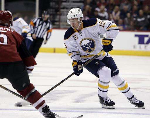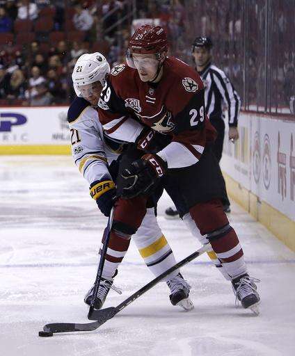 Buffalo Sabres center Jack Eichel (15) drives on Arizona Coyotes defenseman Connor Murphy in the first period during an NHL hockey game, Sunday, Feb. 26, 2017, in Glendale, Ariz. (AP Photo/Rick Scuteri) The Associated Press