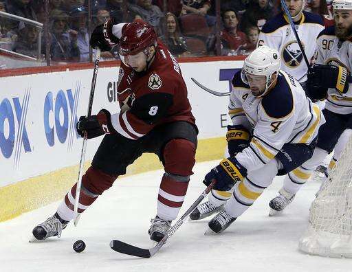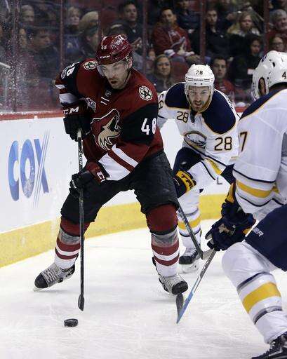 Arizona Coyotes right wing Tobias Rieder (8) shields the puck from Buffalo Sabres defenseman Josh Gorges in the second period during an NHL hockey game, Sunday, Feb. 26, 2017, in Glendale, Ariz. (AP Photo/Rick Scuteri) The Associated Press
