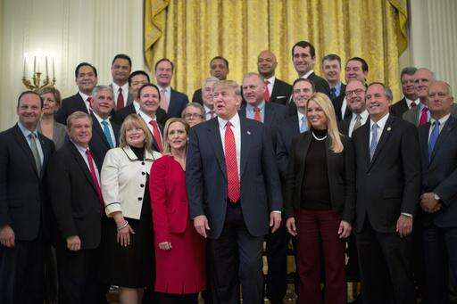 President Donald Trump speaks while posing for a photo with the National Association of Attorneys General, Tuesday, Feb. 28, 2017, in the East Room of the White House in Washington. (AP Photo/Pablo Martinez Monsivais) The Associated Press