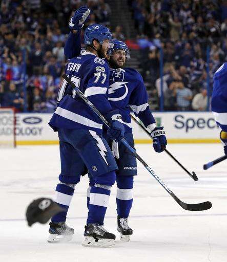 Tampa Bay Lightning's Victor Hedman (77) congratulates Nikita Kucherov (86), of Russia, on his third goal of the second period of an NHL hockey game Monday, Feb. 27, 2017, in Tampa, Fla. (AP Photo/Mike Carlson) The Associated Press