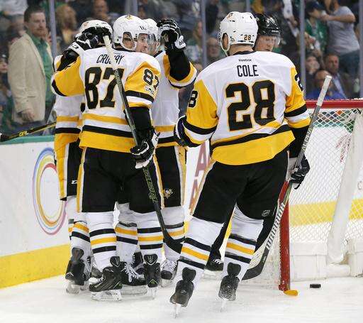 Pittsburgh Penguins' Sidney Crosby (87) and Ian Cole (28) join others in congratulating Jake Guentzel, left rear, after his goal against the Dallas Stars in the second period of an NHL hockey game, Tuesday, Feb. 28, 2017, in Dallas. (AP Photo/Tony Gutierrez) The Associated Press