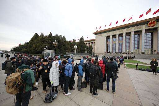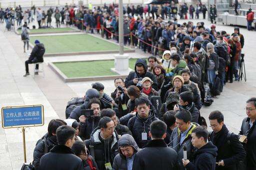 Local and foreign journalists line up to enter the Great Hall of the People to cover the opening session of the annual National People's Congress in Beijing, Sunday, March 5, 2017. China's top leadership as well as thousands of delegates from around the country are gathered at the Chinese capital for the annual legislature meetings. (AP Photo/Andy Wong) The Associated Press