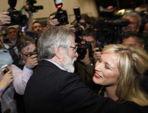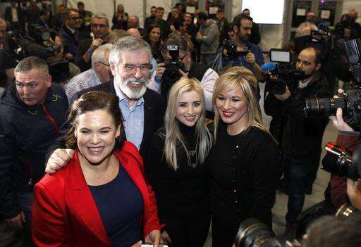 Sinn Fein's Michelle O'Neill , right, is congratulated by party leader Gerry Adams and party members Orlaithi Flynn, 2nd right, and Mary Lou McDonald at the count centre in Belfast, Northern Ireland, Friday, March 3, 2017. Counting has begun across Northern Ireland with Irish Nationalists seeking to boost their vote in an early election that could shape the fate of the Catholic-Protestant cooperation in Northern Ireland. (AP Photo/Peter Morrison)