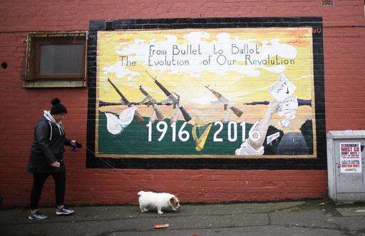 A woman walks her dog past a Republican mural in West Belfast, Northern Ireland, Thursday, March 2, 2017. Voting has begun Thursday in the British province of Northern Ireland to elect a new Stormont Assembly after the power-sharing government collapsed in January. (AP Photo/Peter Morrison)