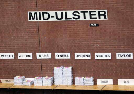 Election papers in Mid Ulster at the count centre in Ballymena, Northern Ireland, Friday, March 3, 2017. Counting has begun across Northern Ireland with Irish Nationalists seeking to boost their vote in an early election that could shape the fate of the Catholic-Protestant cooperation in Northern Ireland. (AP Photo/Peter Morrison)