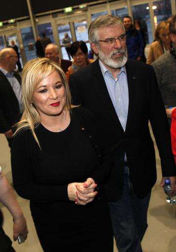 Sinn Fein's Michelle O'Neill and party leader Gerry Adams arrive at the count centre in Belfast, Northern Ireland, Friday, March 3, 2017. Michelle O'Neill was elected for Mid Ulster, Irish Nationalists continue to boost their vote in an early election that could shape the fate of the Catholic-Protestant cooperation in Northern Ireland. (AP Photo/Peter Morrison)