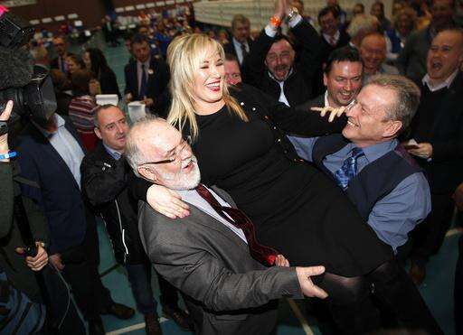 Sinn Fein's party leader for Northern Ireland Michelle O'Neill celebrates with party members Francie Molloy, left, and Ian Milne, right, after toping the poll in Mid Ulster, Ballymena count centre, Northern Ireland, Friday, March 3, 2017. Counting has begun across Northern Ireland with Irish Nationalists seeking to boost their vote in an early election that could shape the fate of the Catholic-Protestant cooperation in Northern Ireland. (AP Photo/Peter Morrison)