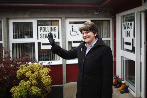 Democratic Unionist Party leader Arlene Foster arrives to cast her vote at a polling station in Brookeborough, Northern Ireland, Thursday, March 2, 2017. Voting has begun Thursday in the British province of Northern Ireland to elect a new Stormont Assembly after the power-sharing government collapsed in January. (AP Photo/Peter Morrison)